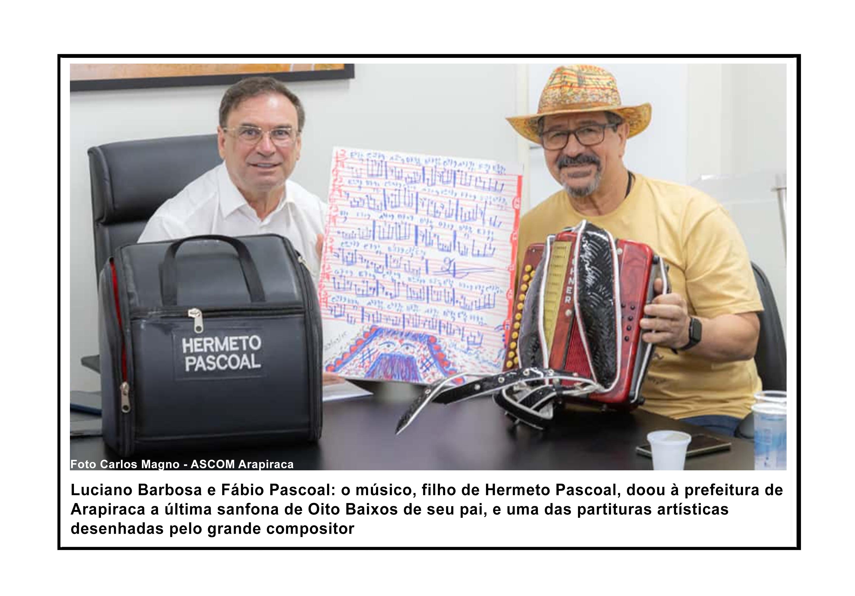 LUCIANO BARBOSA, prefeito de Arapiraca, recebeu, na sexta-feira, 24, o músico Fábio Pascoal, filho de Hermeto Pascoal. Em pauta, dois temas: visita às obras do Conservatório Musical Hermeto Pascoal, e o festival de música que homenageia o fantástico artista nascido em Lagoa da Canoa quando o hoje município era distrito arapiraquense.