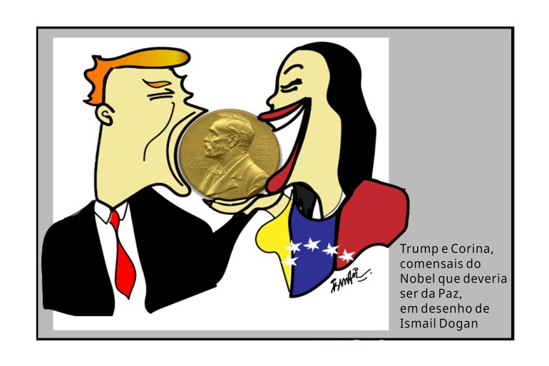 CORINA QUER ESCAMBIAR a medalha como entrada nas prestações do pagamento para o presidente americano colocá-la na cadeira presidencial da Venezuela. Donald ficou verdadeiramente chateado por Maria Machado ter ganhado o Nobel que ele queria para si, buscando se ombrear com seu desafeto Obama. Mas não será menos de 175 gramas de ouro (peso total da medalha, composta por uma liga de prata, ouro e cobre) que fará Trump entregar o poder à vendida Maria, ou a alguma marionete dela, pois, até prova em contrário, é mais fácil e barato manter a chavista Delcy Rodríguez como presidenta. Pelo menos, pelo que se vê, parece ser assim. De toda forma, anuncia-se que o monarca da Casa Branca vai receber Maria Oferecida amanhã e, quem sabe, além condecoração, ela possa dar algo a mais que convença Trump a fazê-la descer de paraquedas no Palácio de Miraflores. Aguardemos os próximos capítulos, mas a vergonha do Nobel da Paz já está garantida, em primeiro lugar, pela deslavada politicagem dos responsáveis pela escolha de quem homenagear.