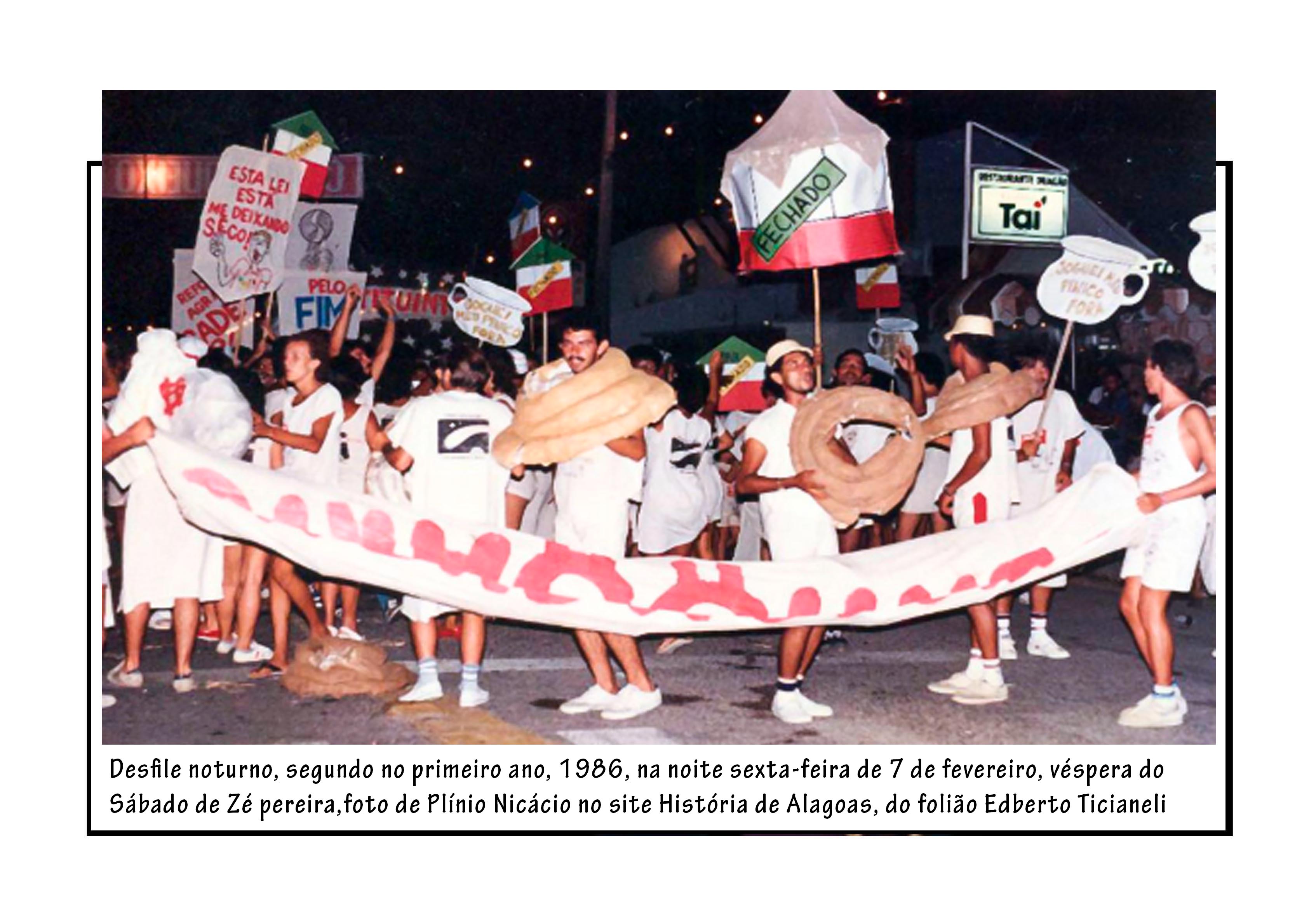 DEPOIS DA DÉCADA 1960, arrefecera o carnaval de rua maceioense. Mingou o público, que migrou para os bailes nos clubes locais e para as ruas de Olinda e Recife. Os antigos blocos como Cavaleiro dos Montes, Sai da Frente, Pitanguinha Vai à Lua, Vulcão, e tantas outras agremiações históricas resistiam bravamente, mas desfilavam para calçadas cada vez mais esvaziadas. Apesar de, em 1975, artistas terem criado o bloco Filhinhos da Mamãe, e em 1983 surgir o Pecinhas de Maceió, era um consenso que o Carnaval de Rua passava por enormes dificuldades. Nesse quadro, no final de 1985, Edécio Lopes, carnavalesco dedicado, através de seu programa Manhãs Brasileiras, na Rádio Gazeta AM, líder incontestável de audiência, resolveu fazer uma provocação tão bem-humorada quanto incisiva ao PCdoB: criar um bloco carnavalesco, transformando em verdade uma brincadeira despretensiosa publicada num efêmero jornal.