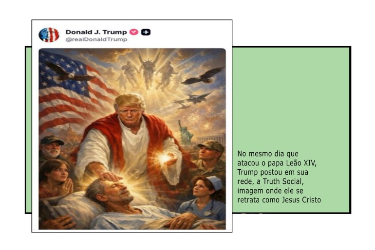 TRUMP ENDOIDOU? Atacar o Papa e insinuar-se como Jesus – ousando postar-se numa imagem como Cristo em trajes alvirrubros (sua cor partidária, dos Republicanos) – não são atitudes de quem se proclama conservador e defensor dos valores cristãos. Isto porque Leão XIV criticou a guerra e pediu para que Estados Unidos, Israel e Irã construam um entendimento pela paz. Antes, no dia 7 de abril, o sumo pontífice católico havia dito que era “inaceitável” a ameaça que “uma civilização inteira morrerá”.